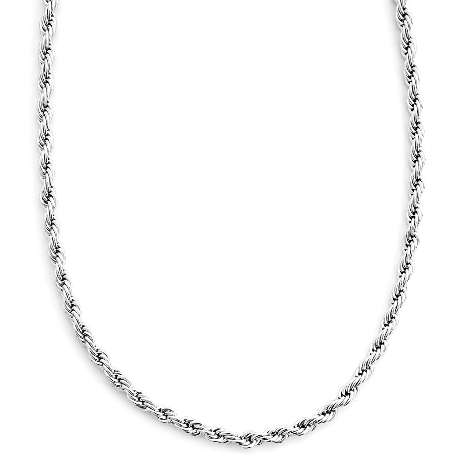Des cordons de métal tressés s’entrelacent pour former cette élégante chaîne en acier chirurgical poli.