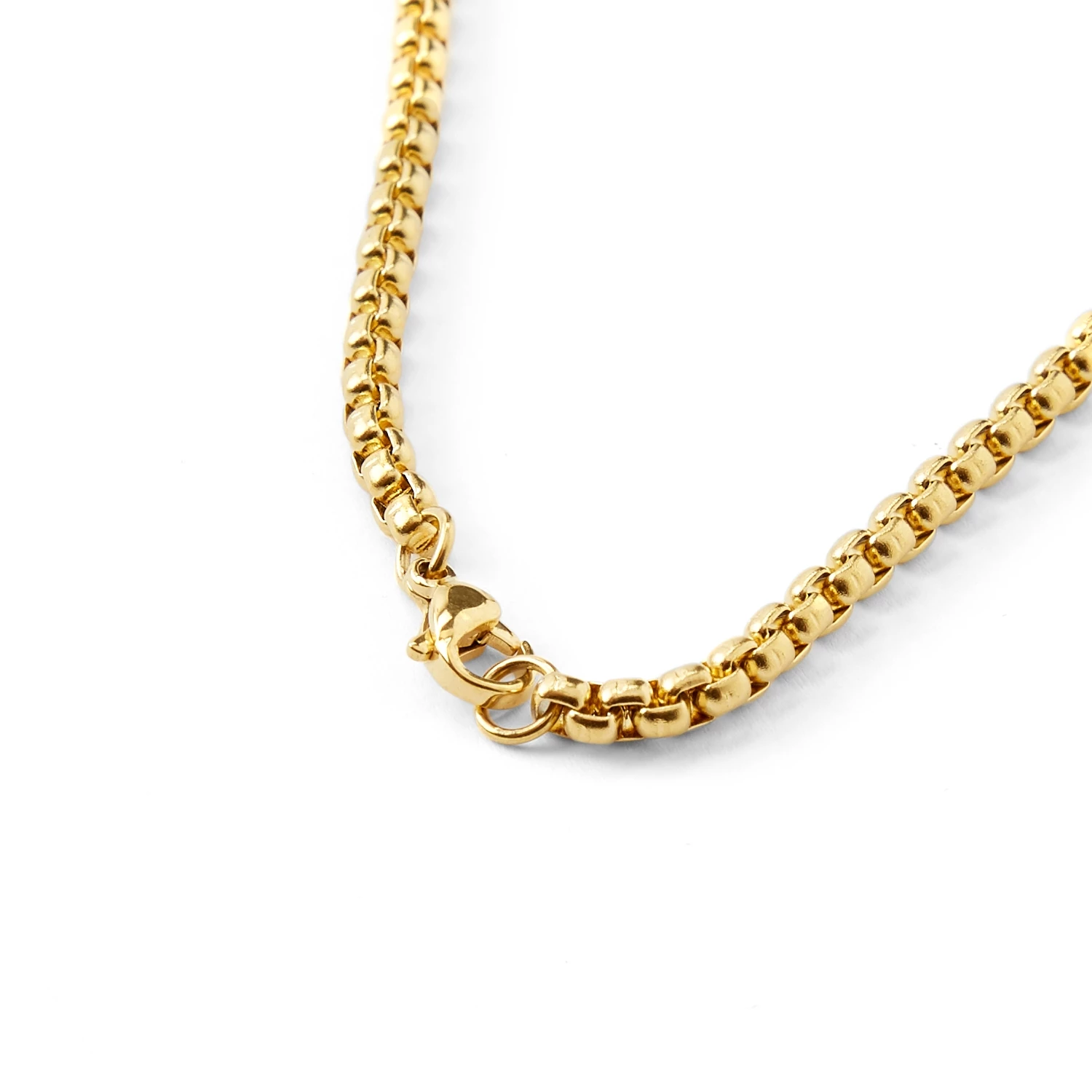 Sa chaîne (sertie d’un fermoir à mousqueton) est constituée du même acier doré que le pendentif afin que l’ensemble forme un tout parfaitement harmonieux.