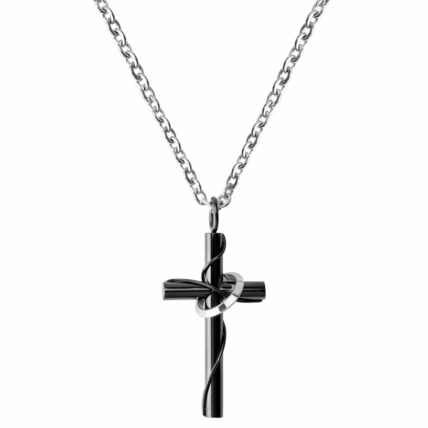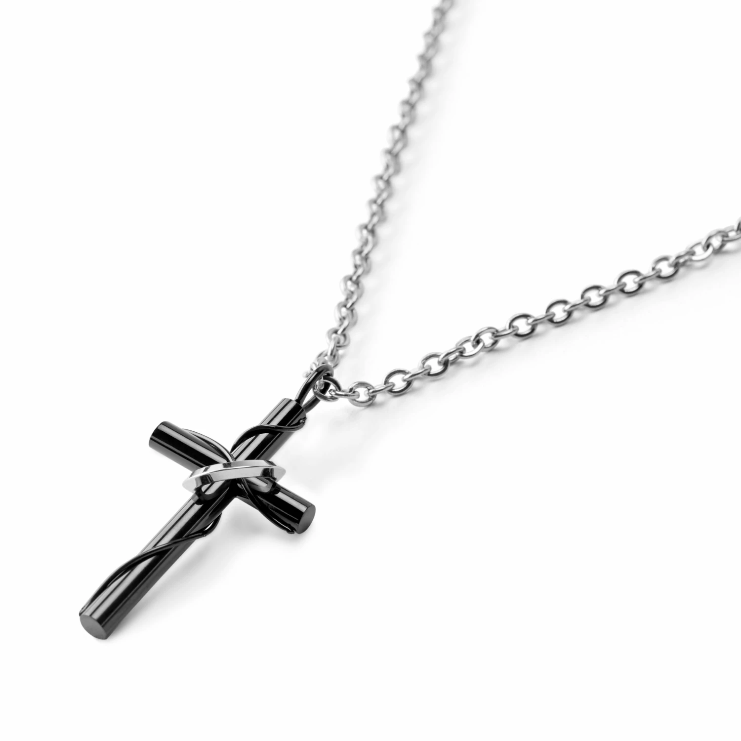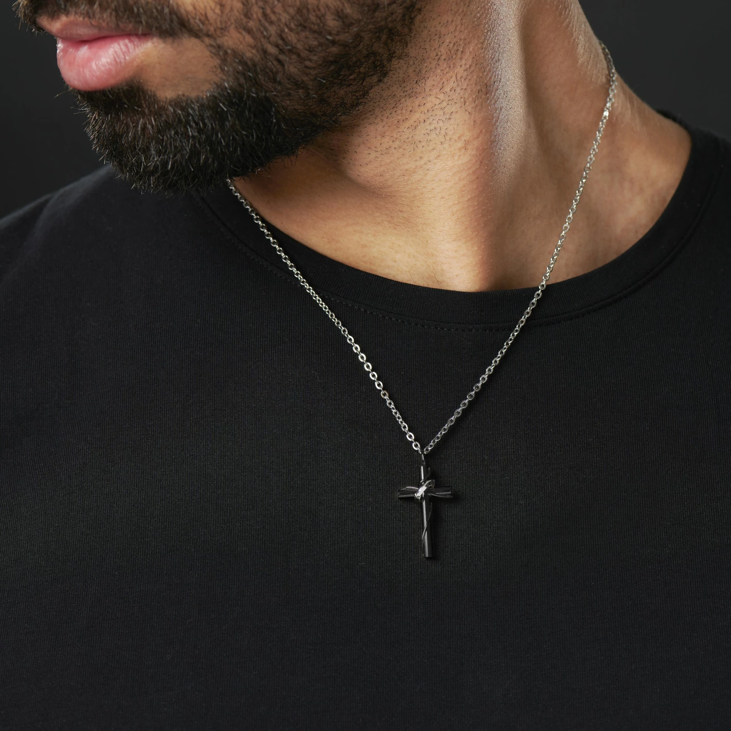 Un simple anneau en acier encerclant son pendentif en forme de croix noire laisse à penser qu’un halo lumineux flotte autour de ce collier. Et qui pourrait dire non à une discrète intervention divine ?