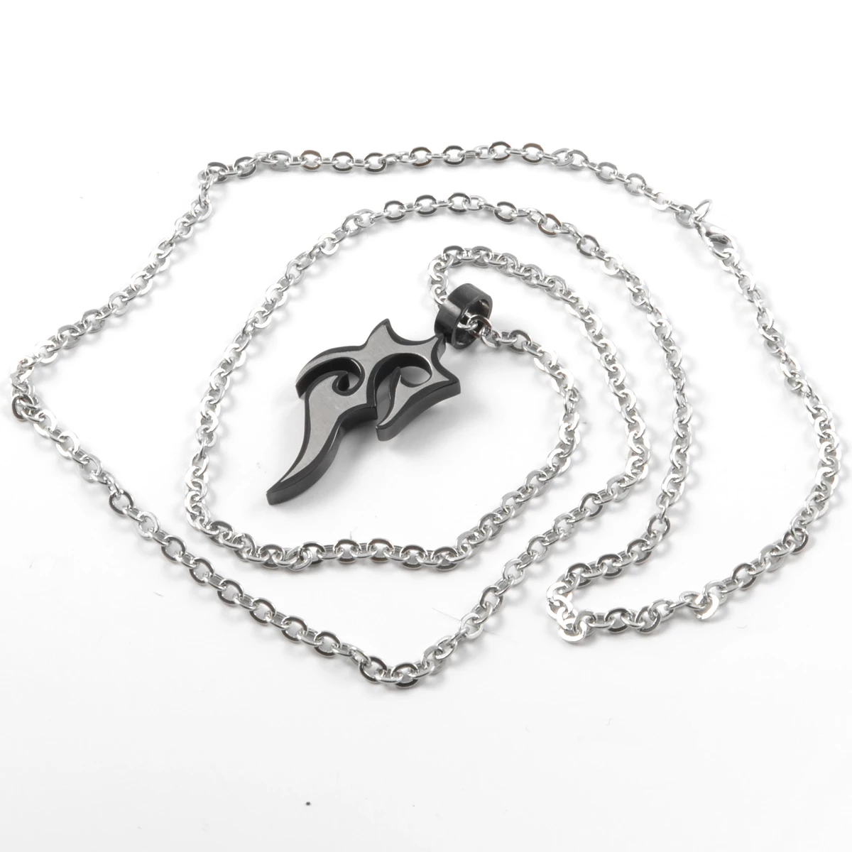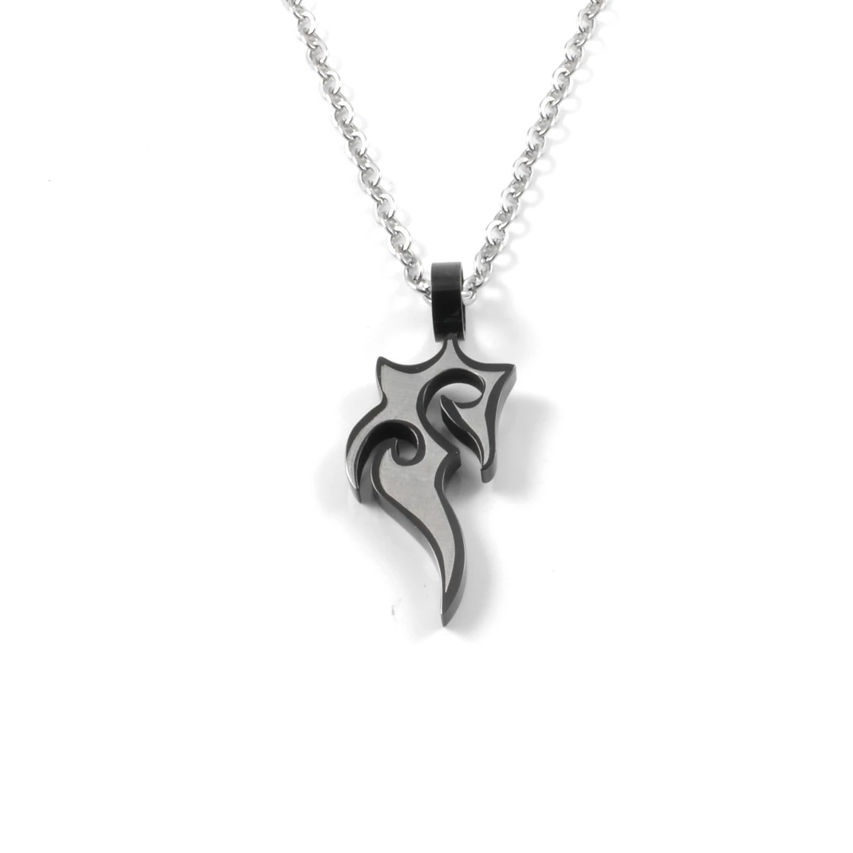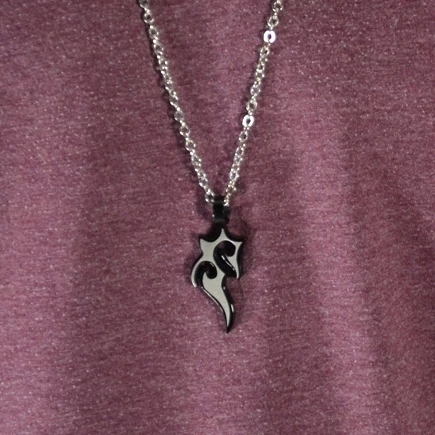 Un pendentif en acier inoxydable en forme d’éclair avec placage noir reposant sur une chaîne en acier inoxydable réglable en longueur.
