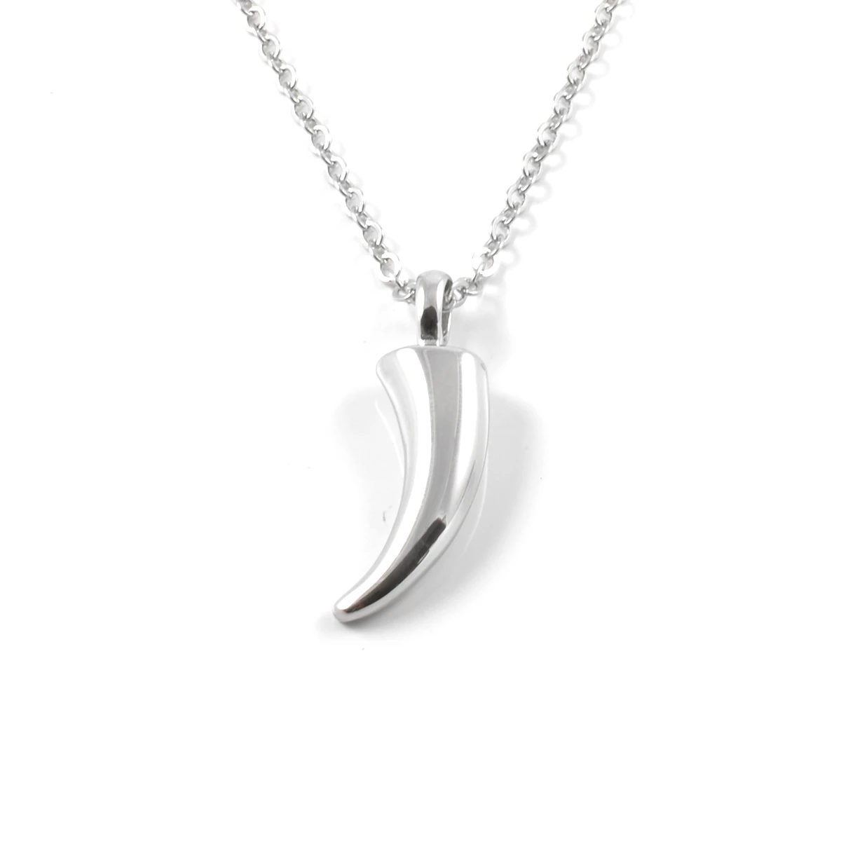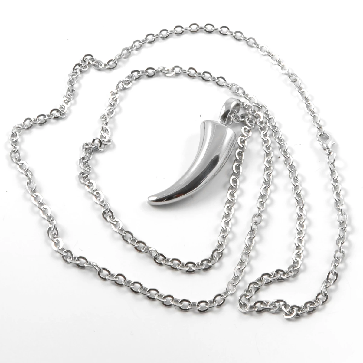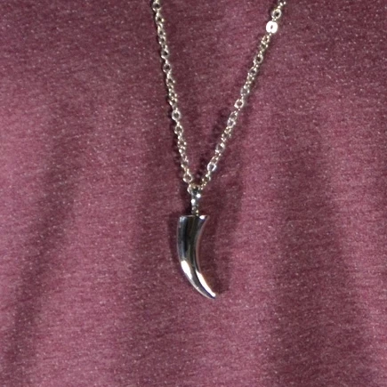 Une dent argentée en acier inoxydable suspendue à une chaîne du même matériau.