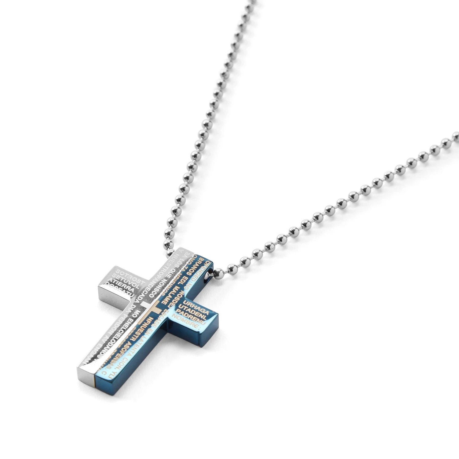 Le pendentif de ce collier est réversible, l’une de ses faces étant décorée d’inscription tandis que l’autre est en acier acier brossé. Une petite croix est dessinée en son centre à l’intersection de ses deux sections de couleurs différentes (sur sa face avant). La palette de couleurs bleu et argent procurent une élégante touche masculine à cet accessoire contemporain.