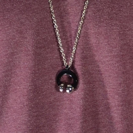 Un pendentif unique en forme d’écouteurs fait en acier inoxydable poli. La partie du bandeau est peinte en noire.