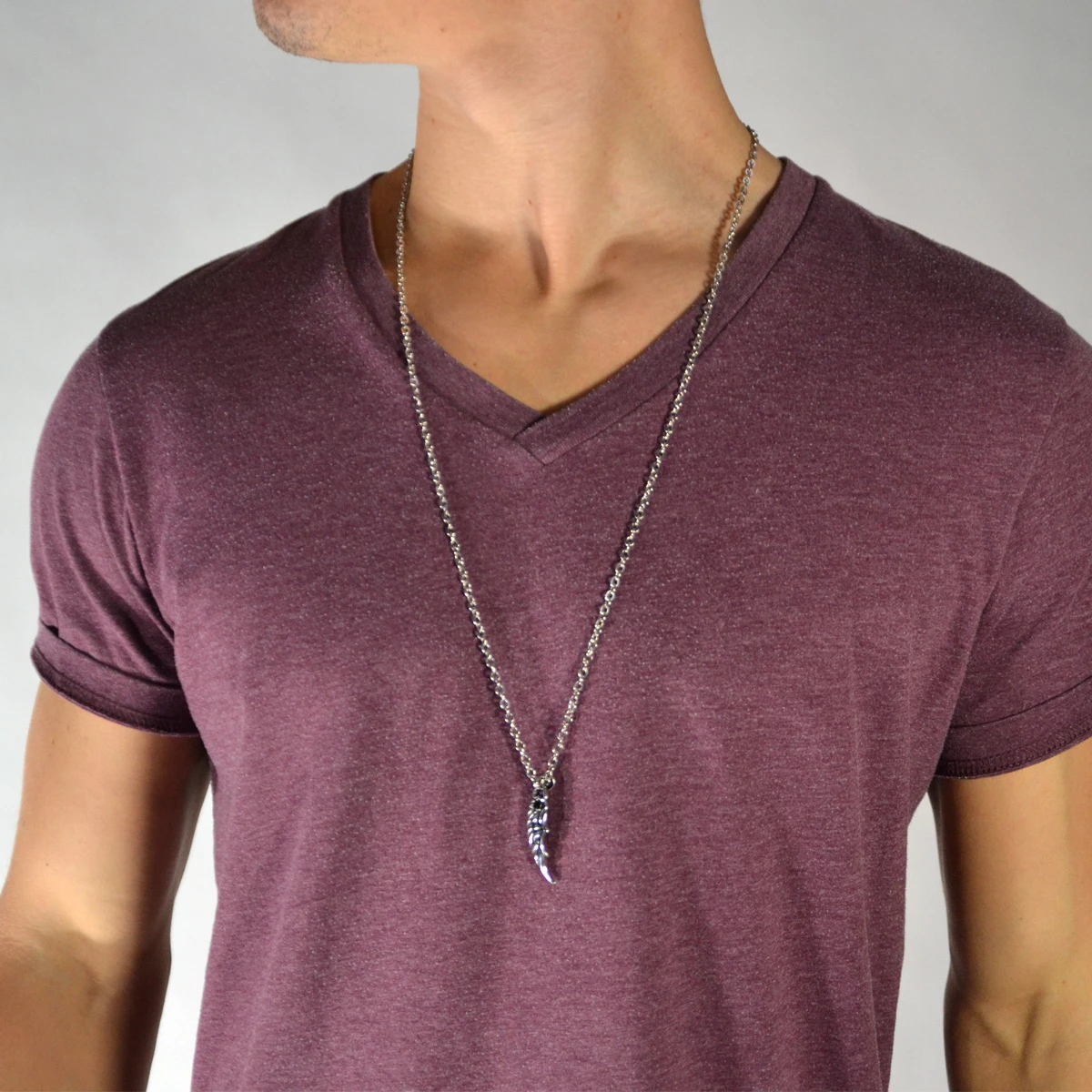Un pendentif en acier inoxydable poli avec quelques détails peints en noir pour lui donner plus de personnalité. Il a à sa base une imitation diamant noir en zircone et mesure 3,6 cm de long auxquels il faut ajouter 0,8 cm pour le petit anneau qui lui permet d’être relié à sa chaîne. Il mesure 1 cm de large à son point le plus large.