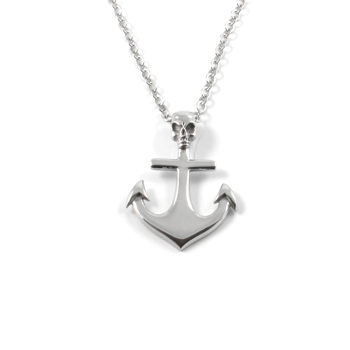 Ce pendentif a la forme d’une ancre au sommet de laquelle est posée une tête de mort. Le pendentif est fait en acier inoxydable, l’ancre mesure 4,5 x 3,2 cm.