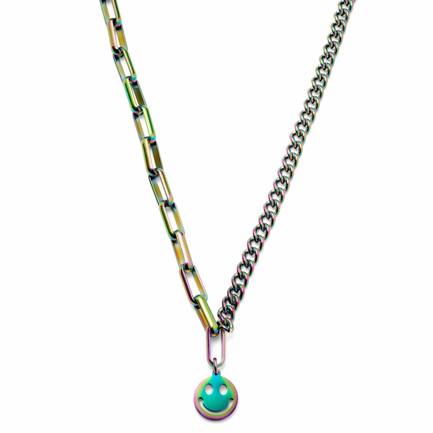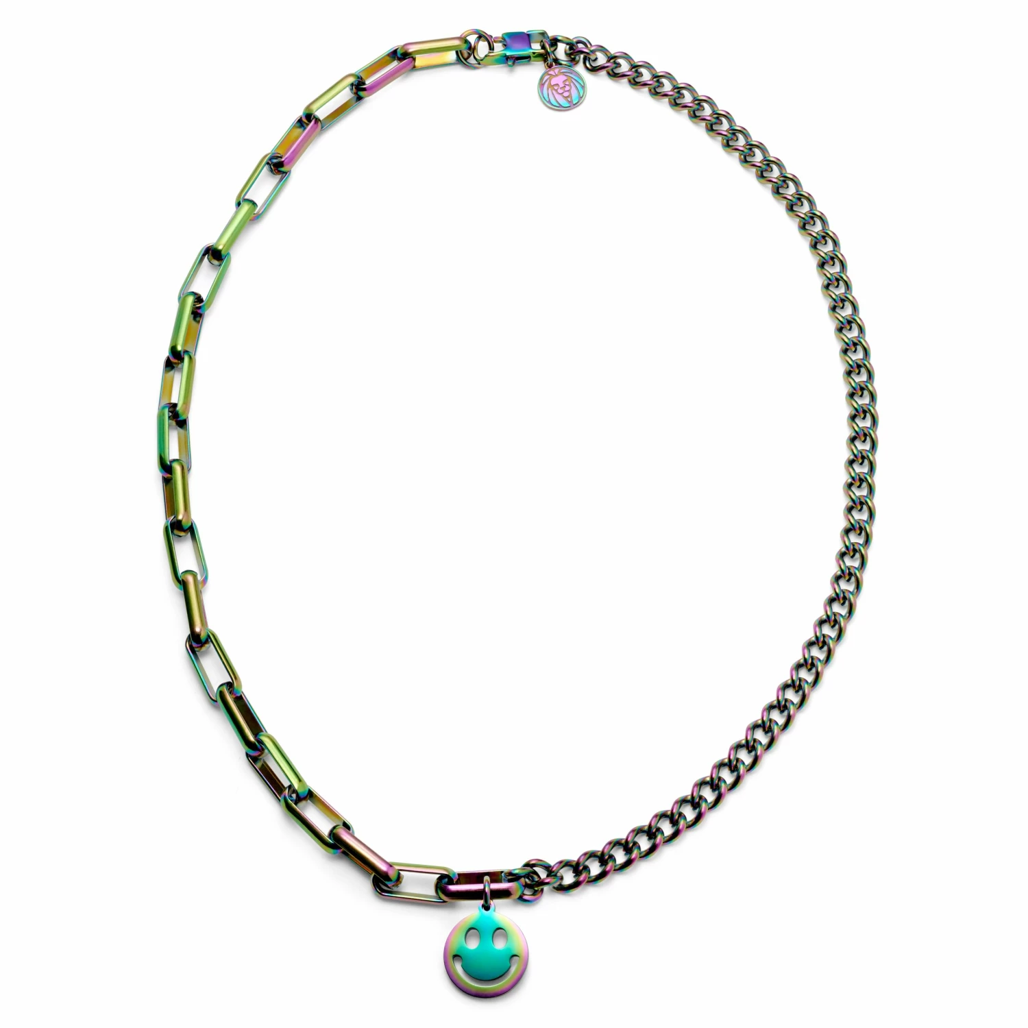 Lorsque votre look nécessite un accessoire hors du commun, ce pendentif smiley se fera un plaisir de répondre à l’appel et sa finition irisée arc-en-ciel ne manquera pas d’attirer l’attention.