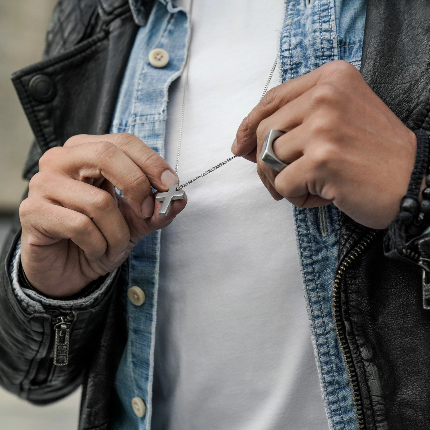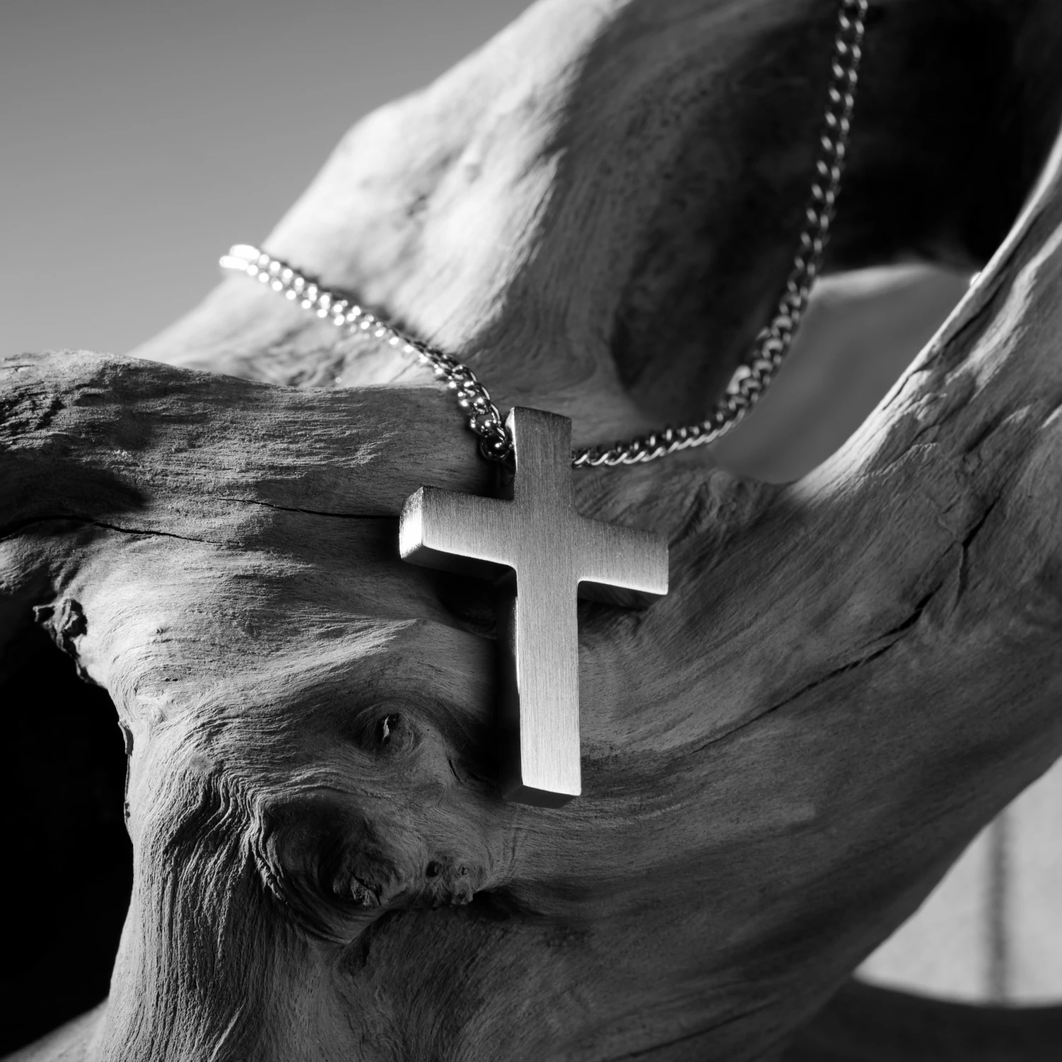 Ce collier est équipé d’un pendentif en acier argenté brossé en forme de croix chrétienne et d’une chaîne en acier massif. Cette chaîne peut être ajustée en longueur sur 10 cm.