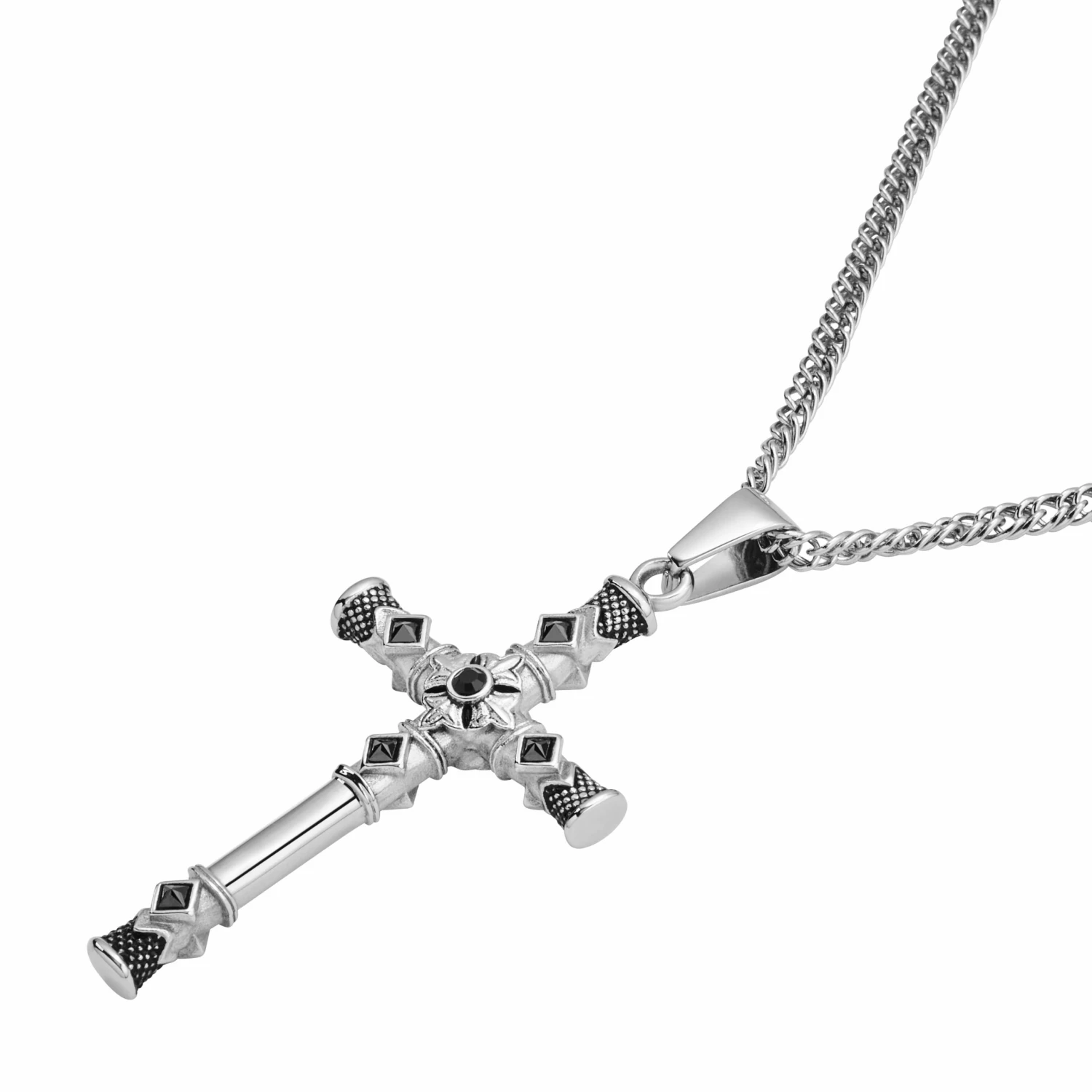 Ce pendentif orné d’une croix est inspiré du style des bijoux des monarques européens et il est enrichi de pierres de zircone noire.