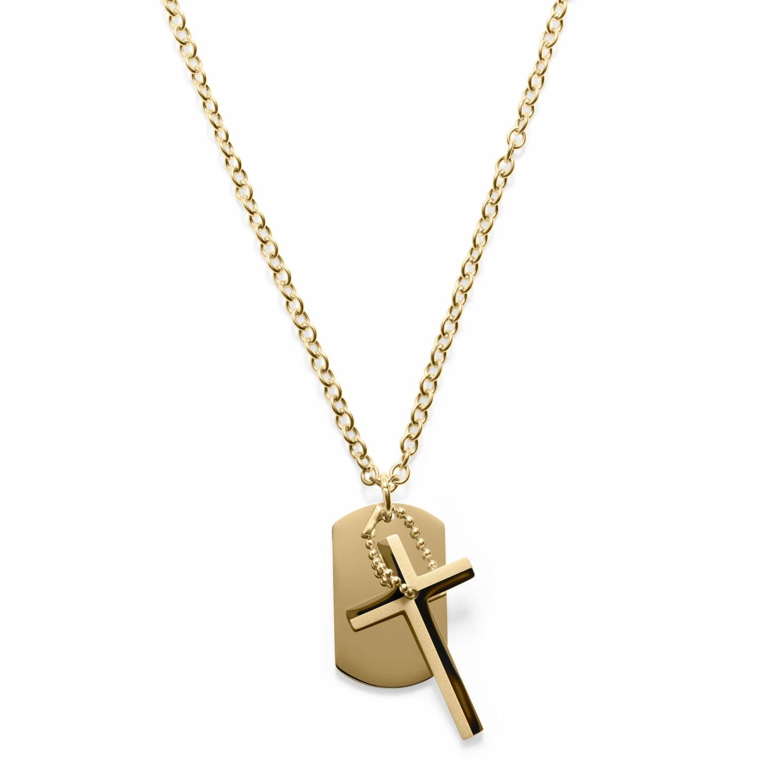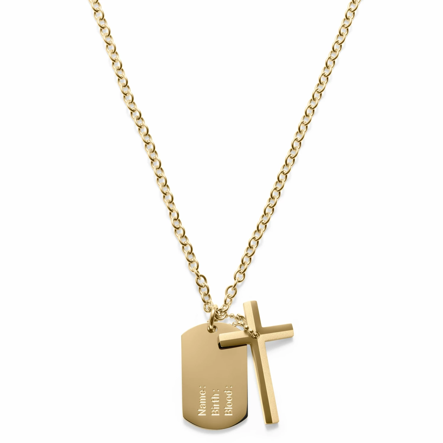 Fabriqués en acier inoxydable de qualité chirurgicale, le pendentif croix et la plaque d’identité de ce collier arborent une élégante finition couleur or.