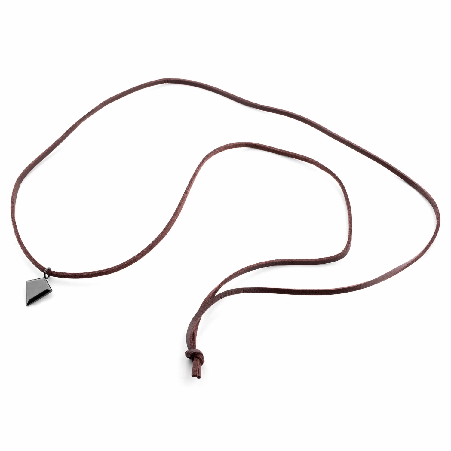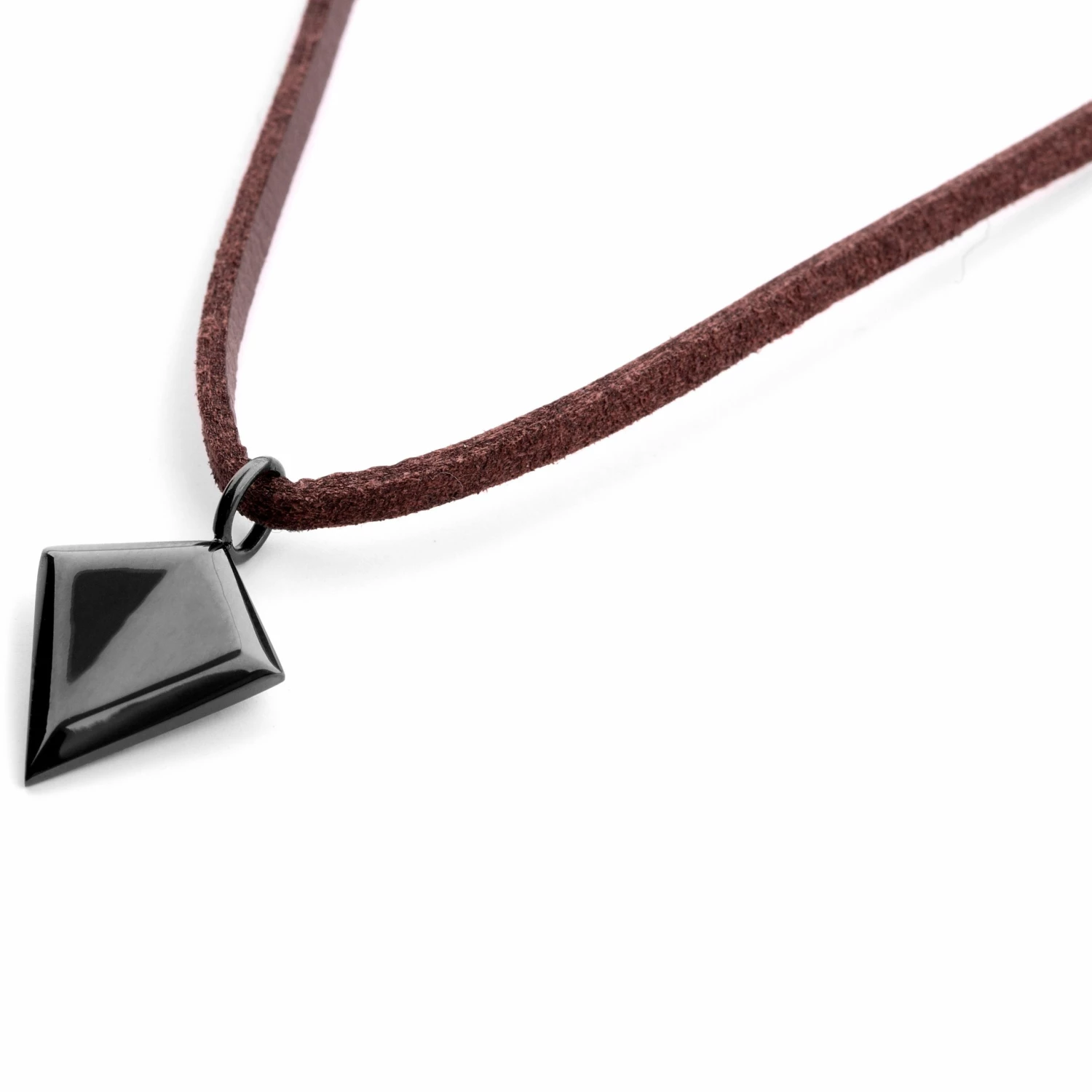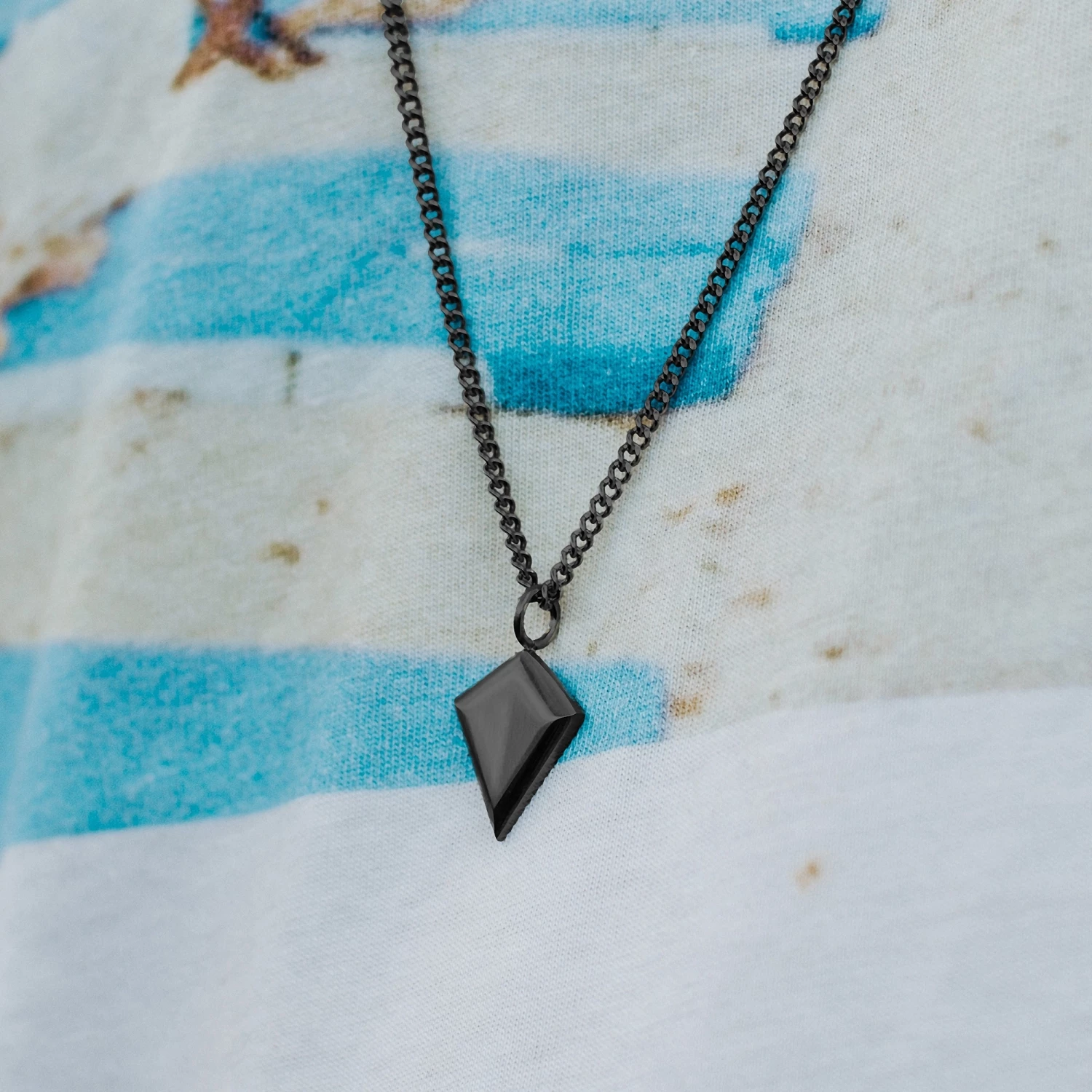 Ce pendentif en forme de diamant noir à la finition satinée respire la force et l’élégance. Ses extrémités tranchantes, sa construction d’acier chirurgical, ses arêtes effilées, la manière dont il reflète la lumière… son dessin a quelque chose de proprement irrésistible difficile à définir.
