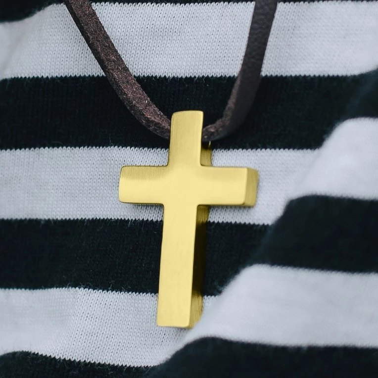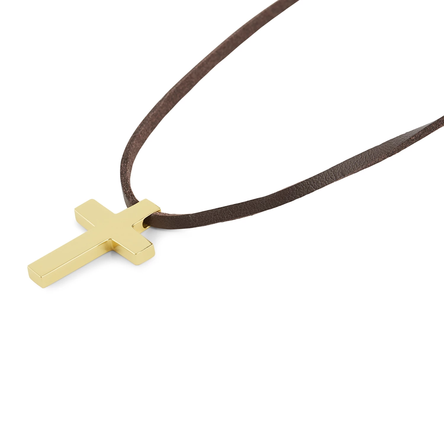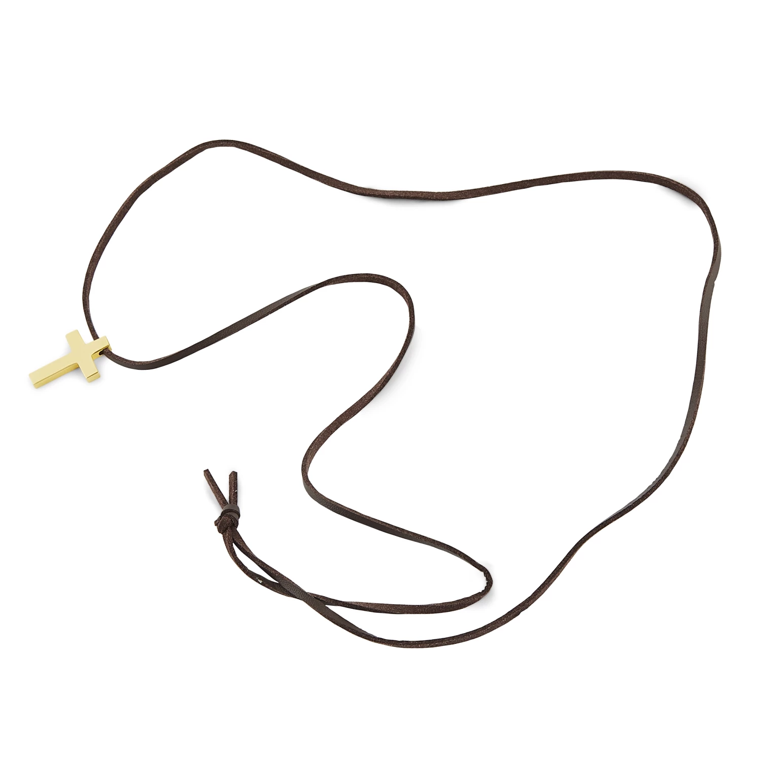 Un sacré collier en cuir serti d’un pendentif en forme de croix dorée. Vous pourrez l’ajuster en le dénouant et en le renouant à la longueur désirée.