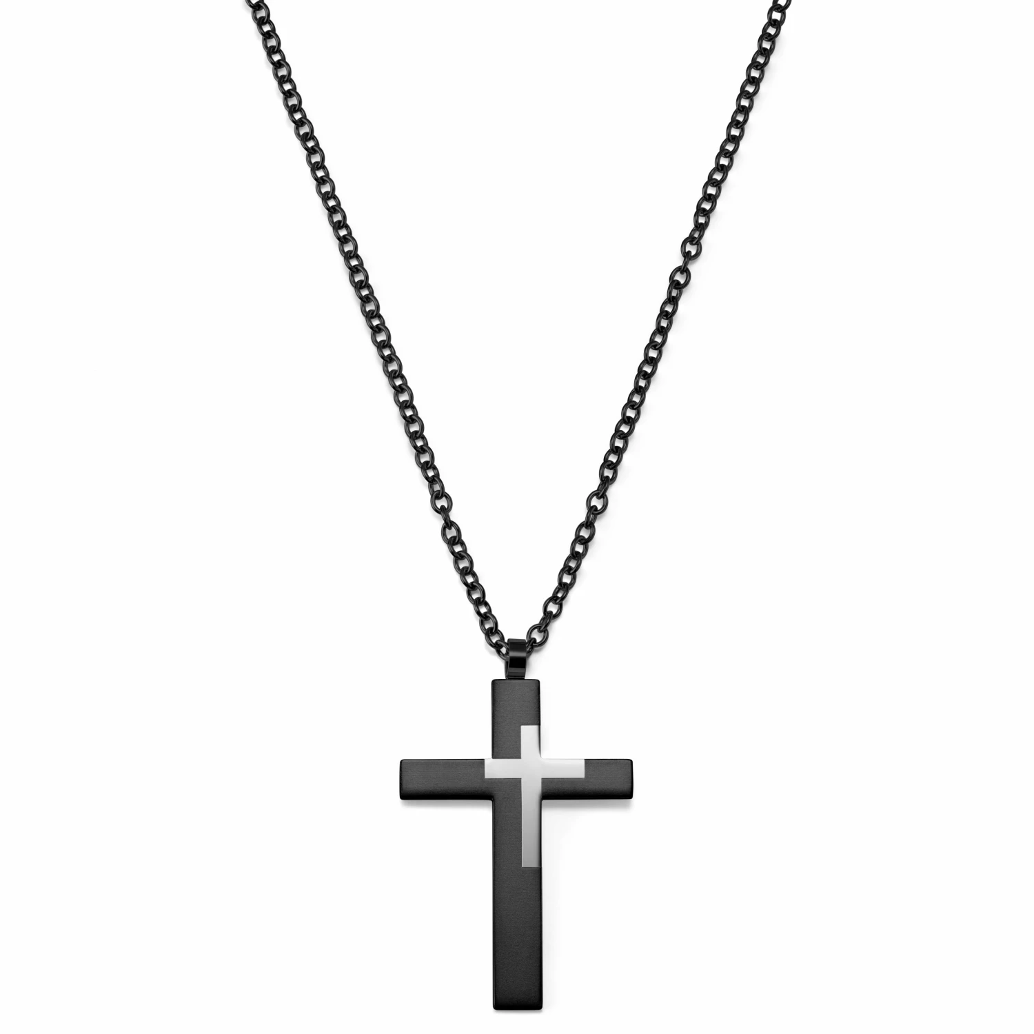 Un collier pour homme avec pendentif de grande taille en forme de croix, fabriqué en acier chirurgical de couleur argenté et bronze gunmetal.