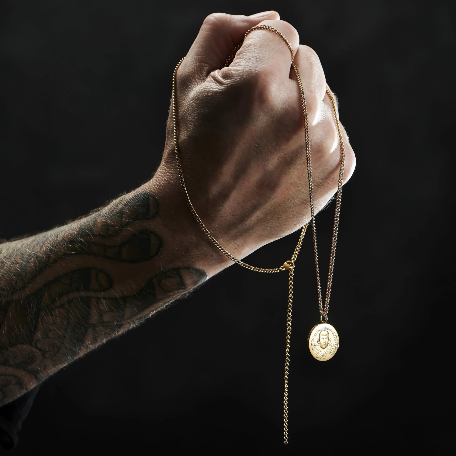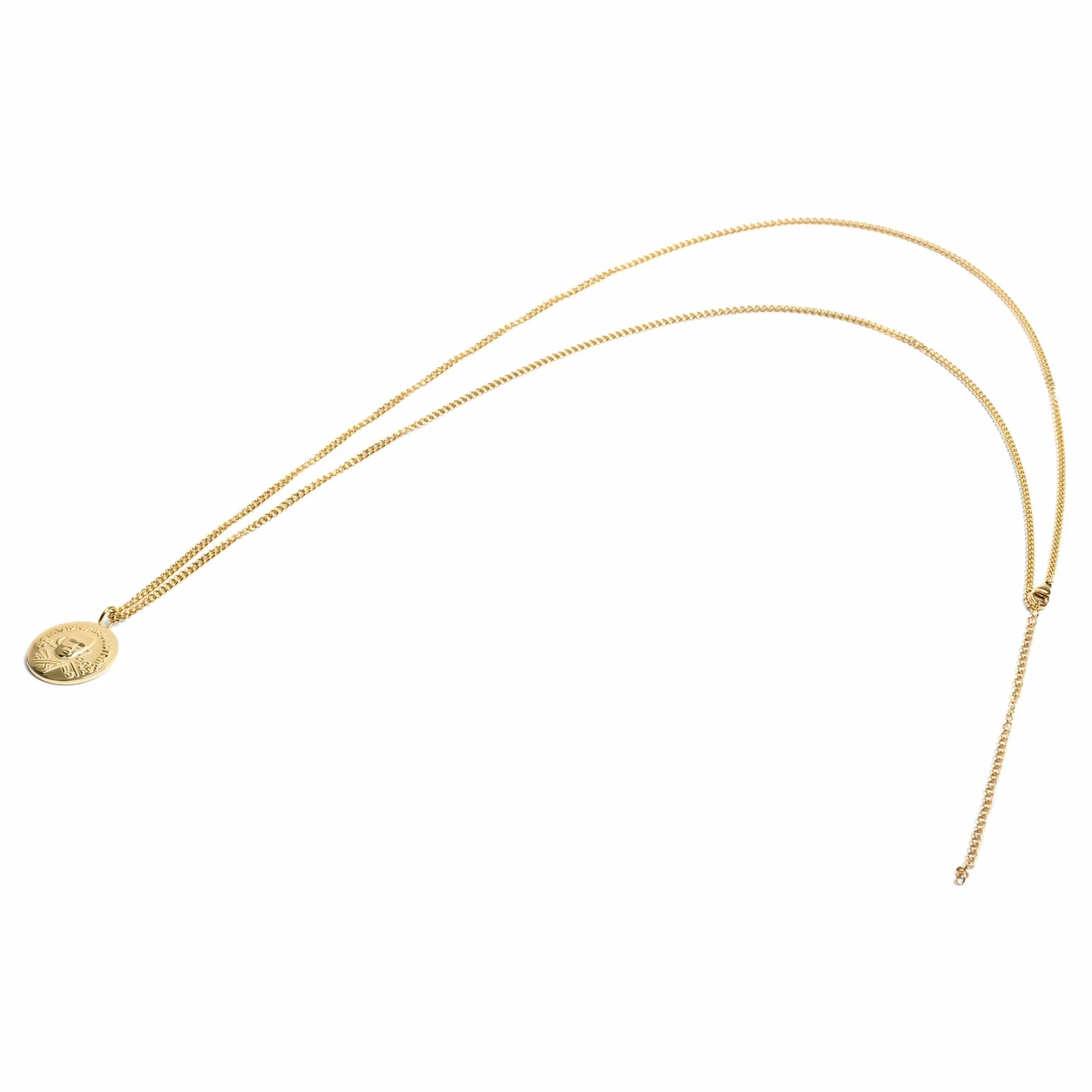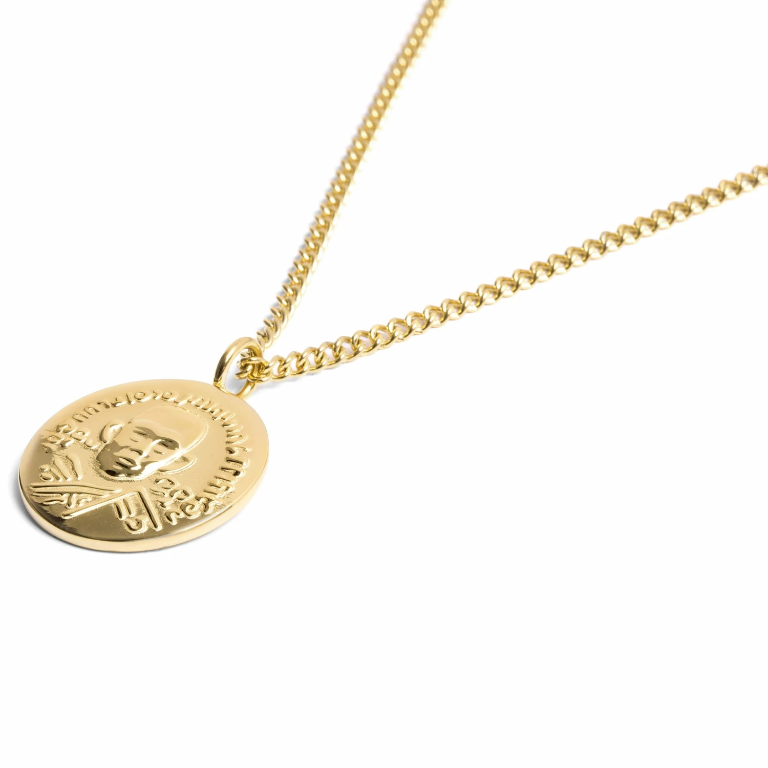 « Allez et portez ce collier avec fierté et élégance » est le message que semble communiquer le visage décorant ce pendentif doré au brillant exceptionnel. « Vous aurez un look à tomber. Croyez-moi. » semble répéter le texte en sanskrit et les symboles qui l’encadrent.