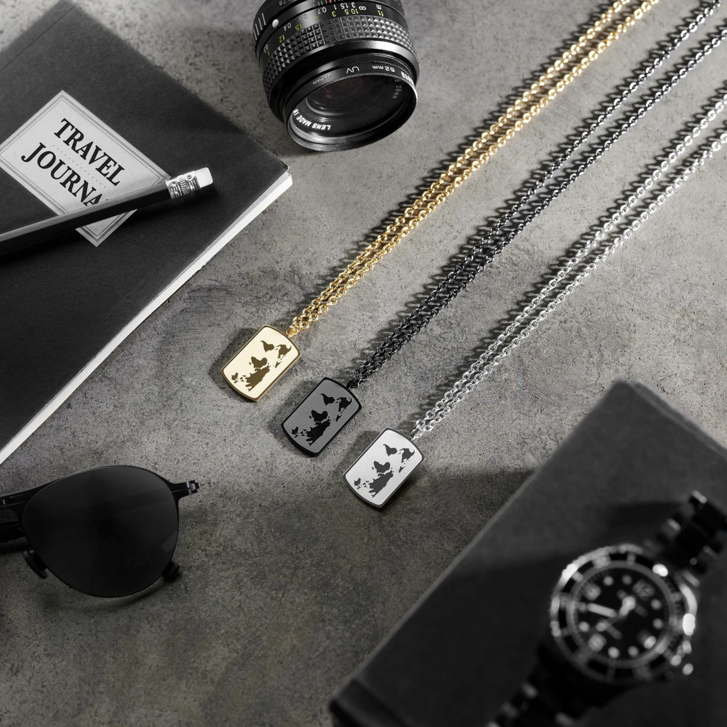 La face avant du pendentif représente une carte détaillée du monde, tandis que la face arrière est polie, parfaite pour y faire apparaître la gravure de votre choix.