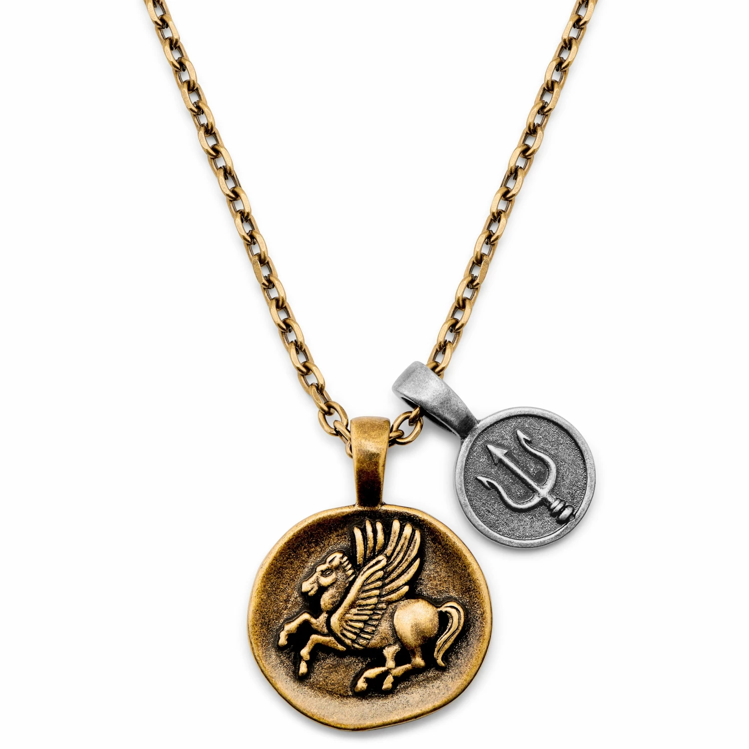 Le cheval Pégase était immortel et indomptable : le symbole de la liberté absolue. Ce collier à double pendentif pour homme est également accompagné d’un pendentif de petite taille représentant un trident, en référence au père de Pégase, Poséidon.