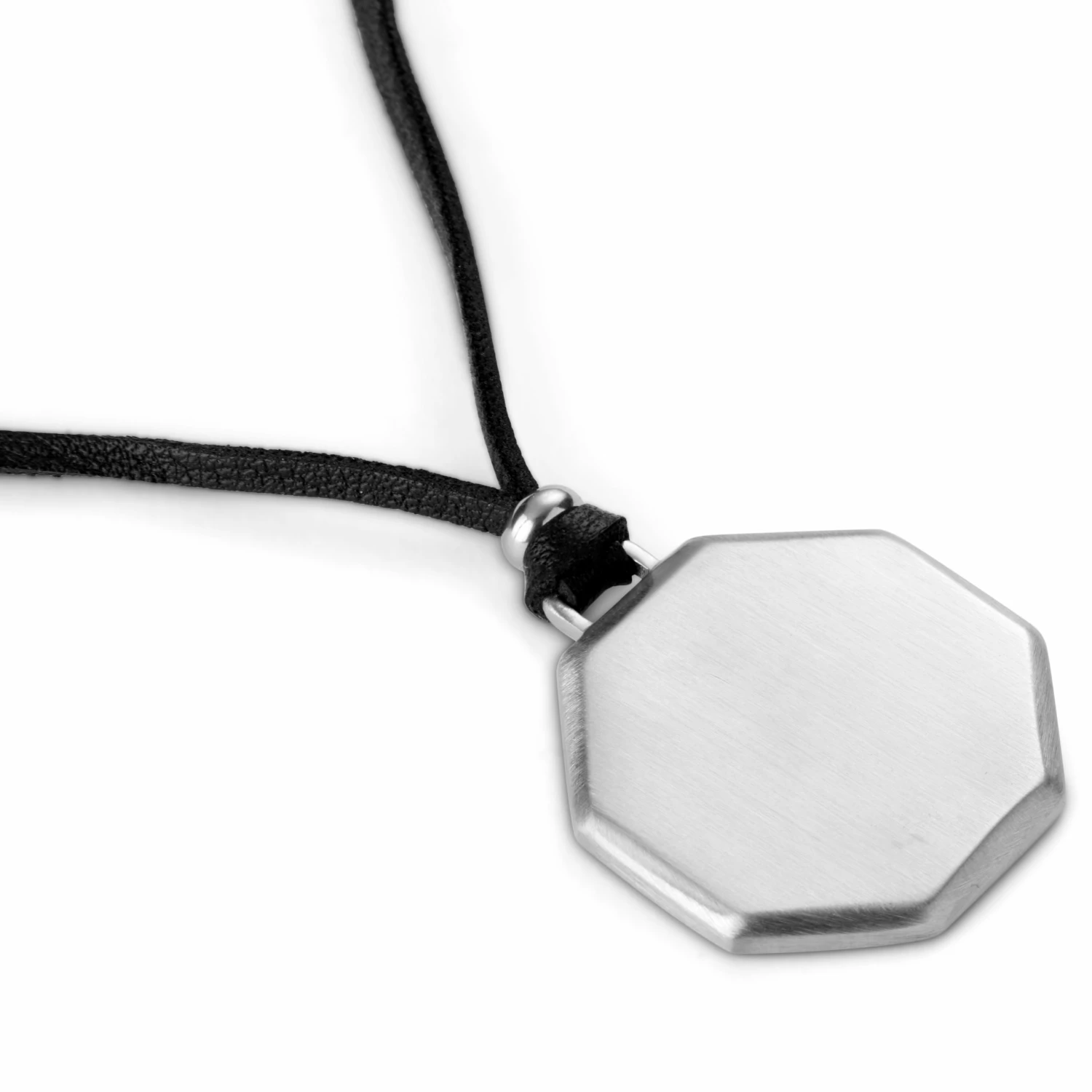 Le pendentif en forme d’octogone est suspendu à un collier de corde ajustable. Pour un ajustement parfait, faites simplement glisser les nœuds.