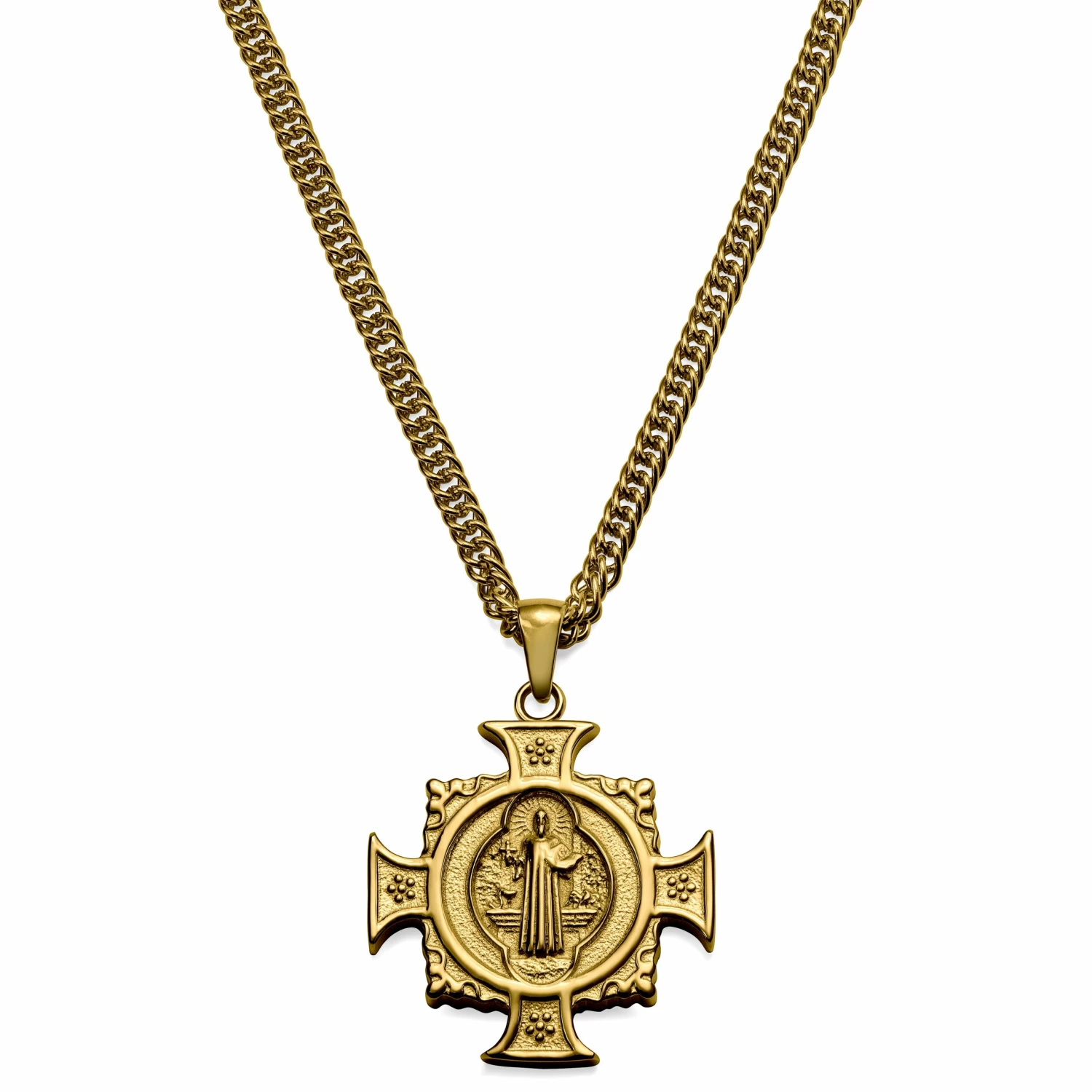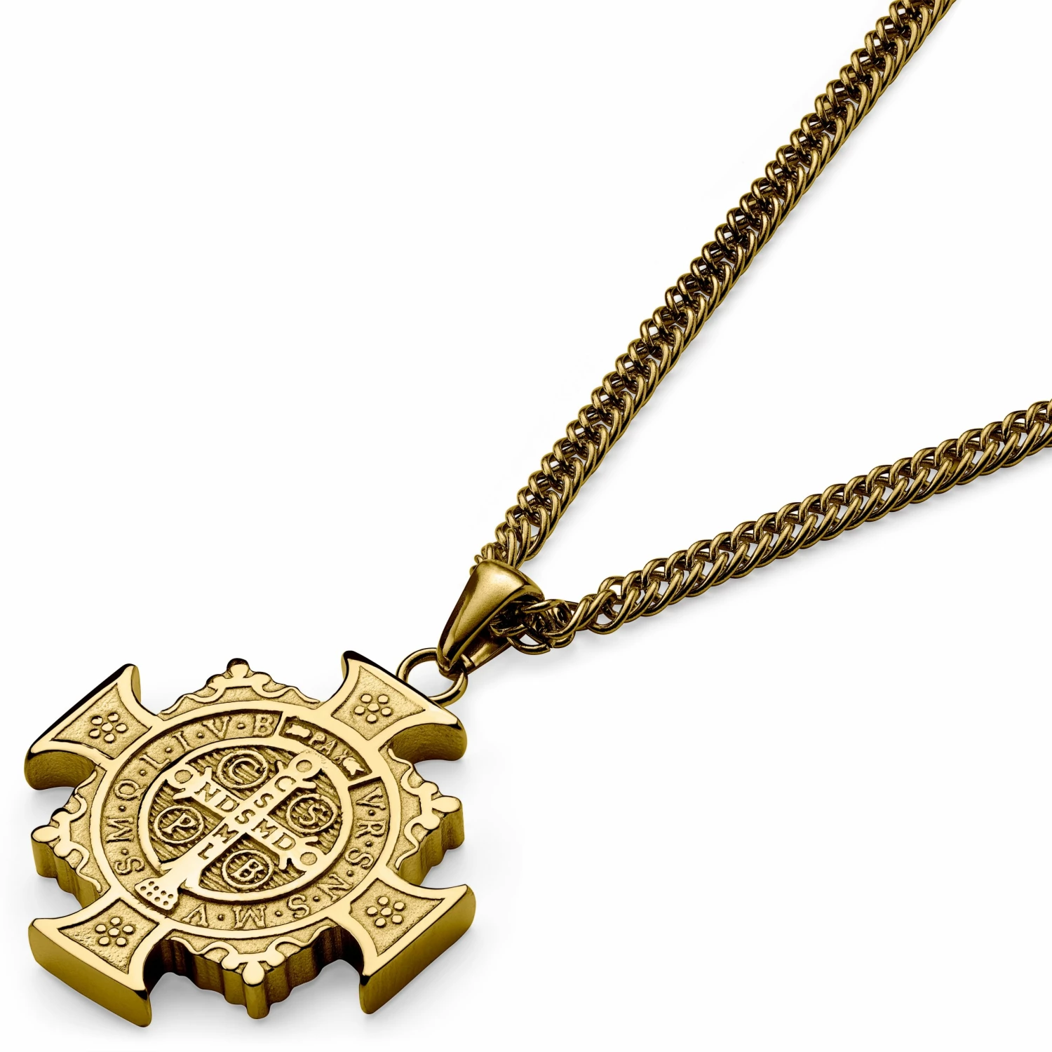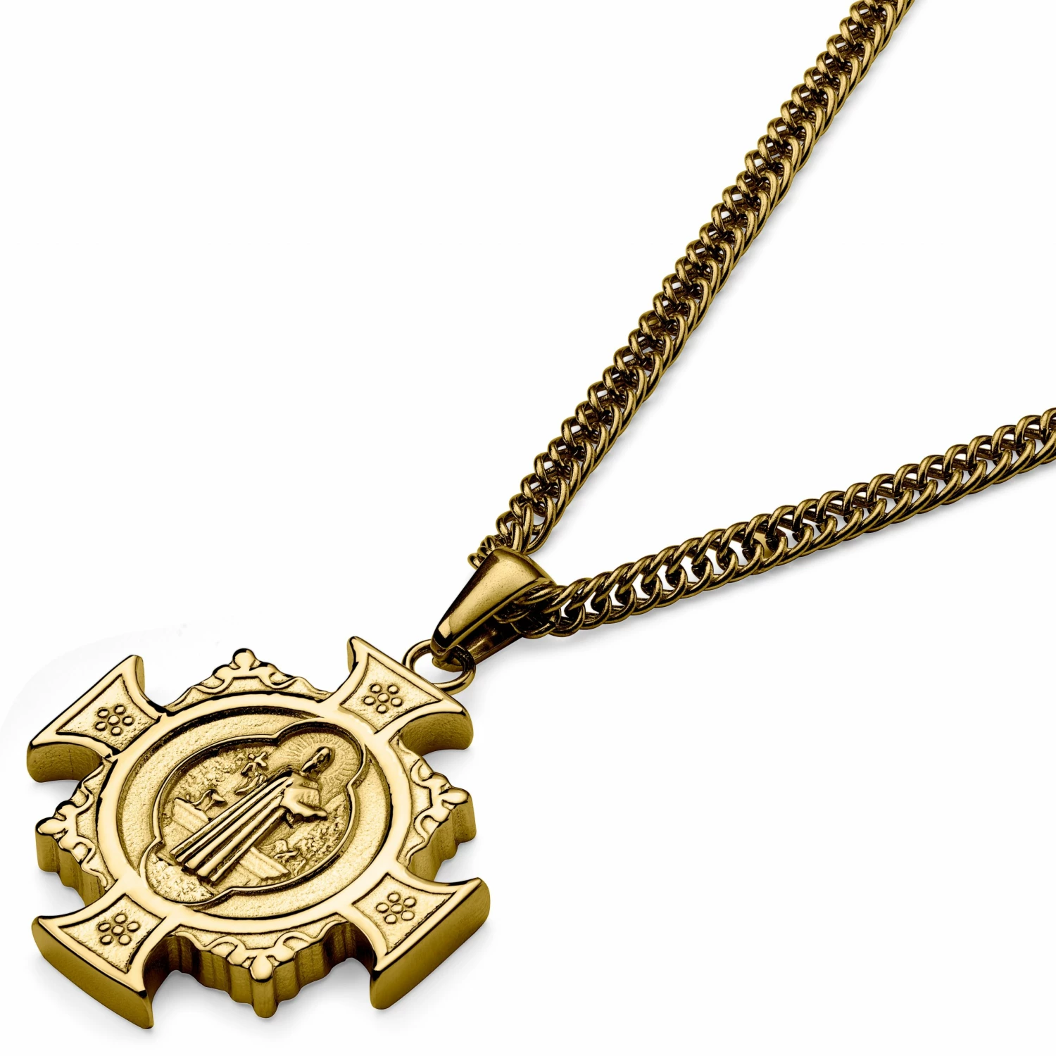 Ce pendentif en acier doré pour homme a été fabriqué en acier inoxydable chirurgical, tout comme la double chaîne gourmette à laquelle il est suspendu. La double chaîne vous offre l’assurance que même si un maillon venait à se briser, le collier ne tomberait pas, car il serait soutenu par le maillon suivant sur la chaîne. Son fermoir à mousqueton durable et sa chaîne de longueur ajustable vous permettront de régler de manière précise où le pendentif tombera sur votre poitrine.