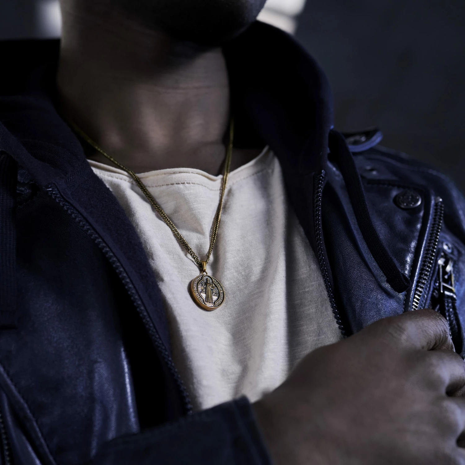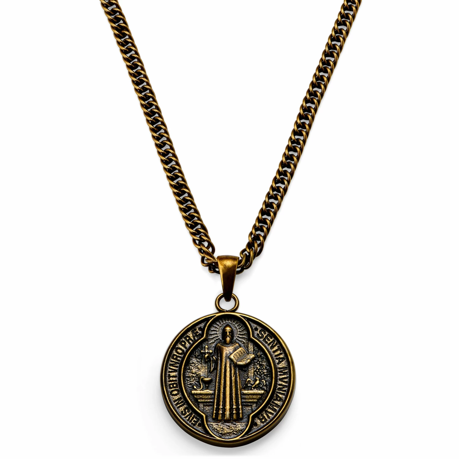 Ce pendentif en acier doré tire son nom de la célèbre médaille de Saint Benoît.