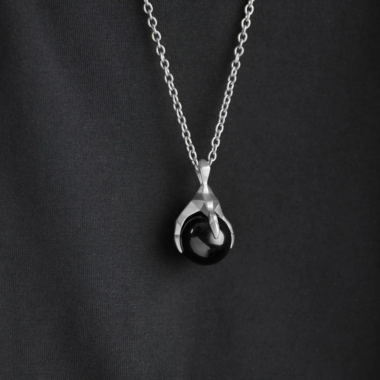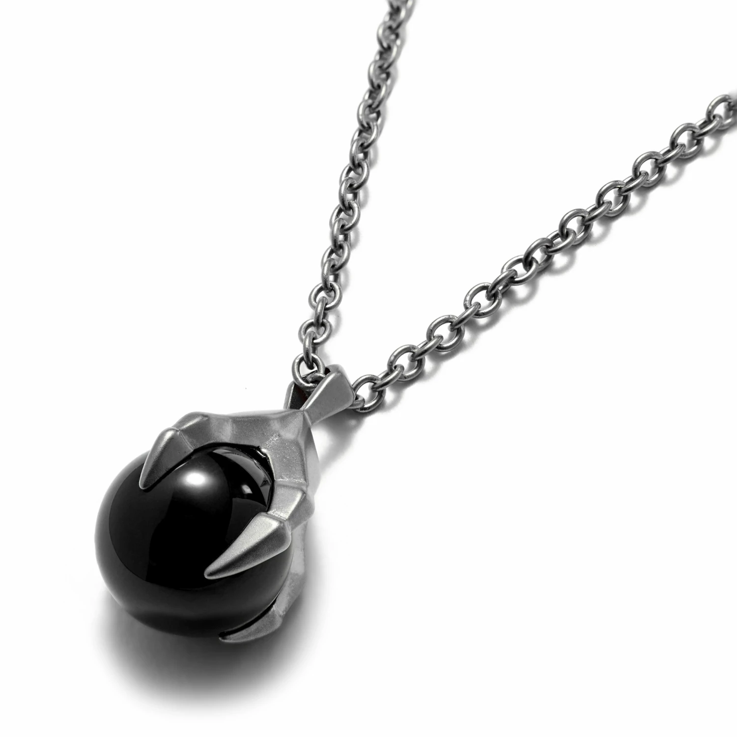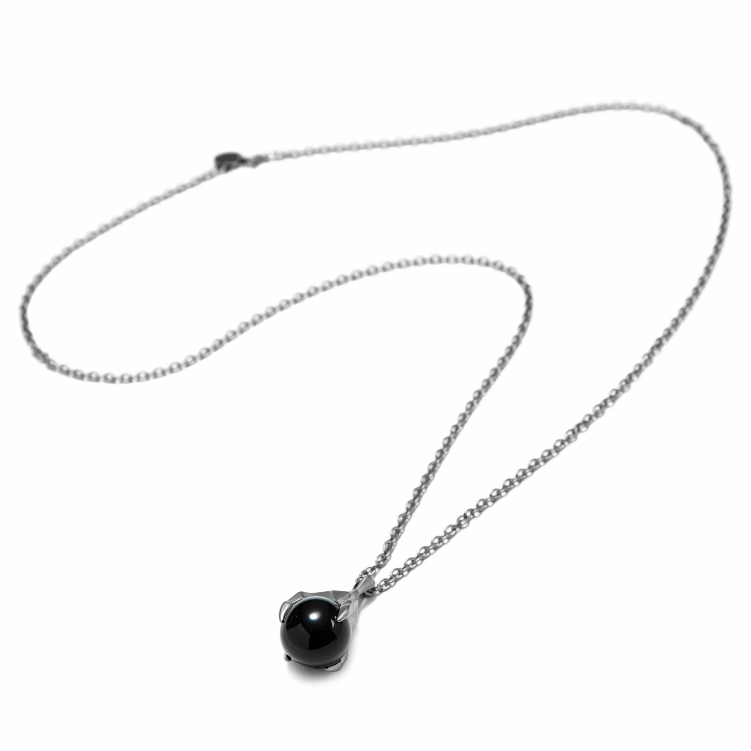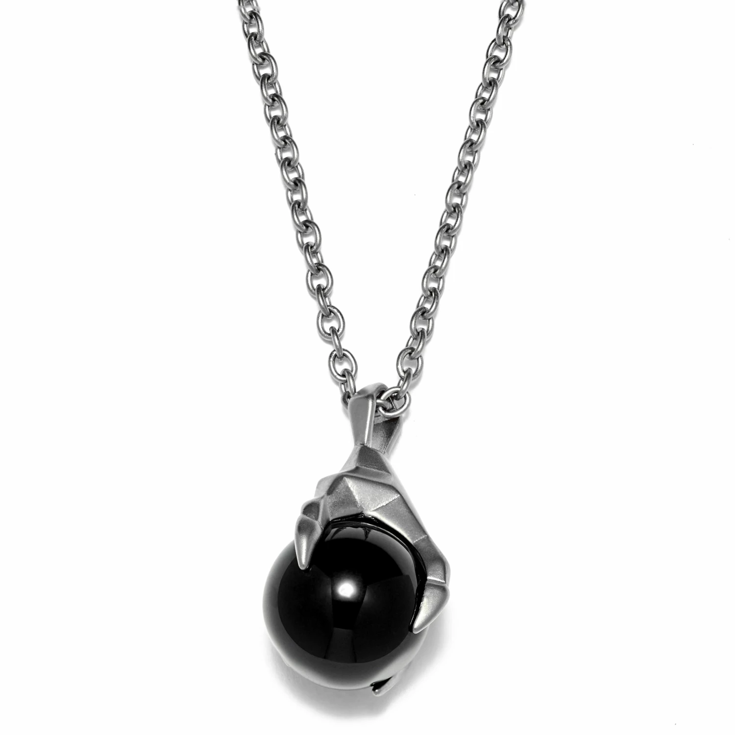Les Vikings sculptaient des têtes de dragon aux deux extrémités de leurs drakkars pour effrayer les monstres se cachant dans les profondeurs marines. Ce collier en acier inoxydable représente une pierre d’agate noire polie prise au piège dans la serre d’un dragon viking.
