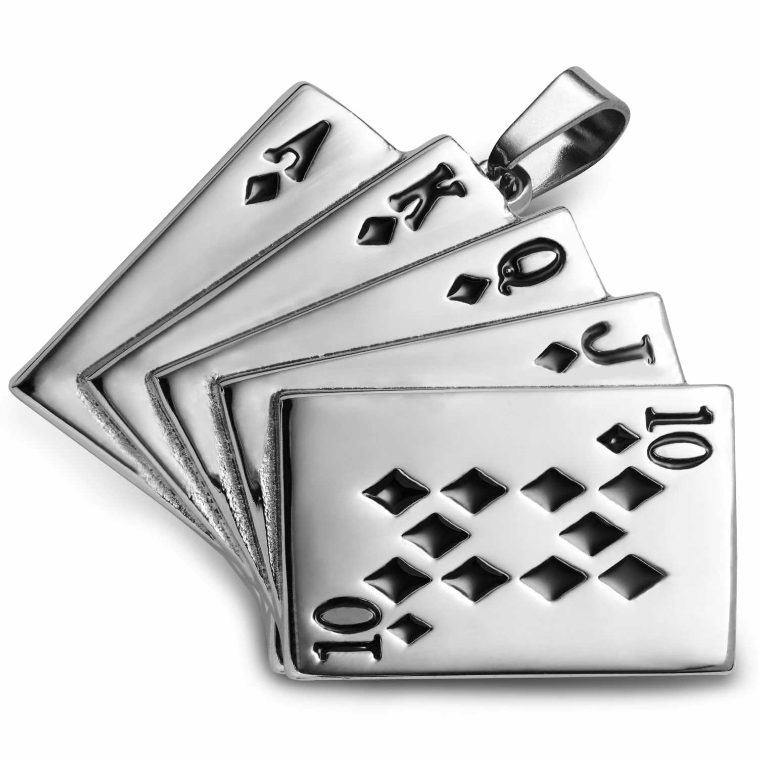 Ce pendentif pour homme à la finition détaillée représente une quinte flush royale en carreaux noirs. Il a été fabriqué en acier chirurgical poli et résistera au ternissement et aux rayures, l’acier 316L étant bien plus résistant que les traditionnels métaux précieux.