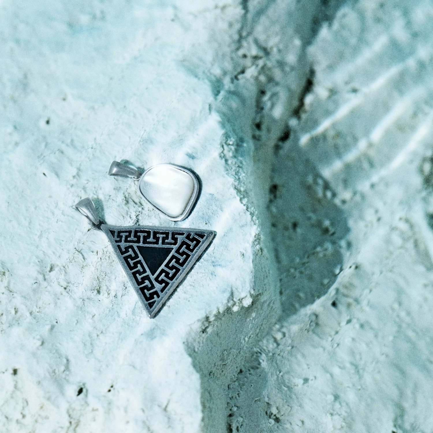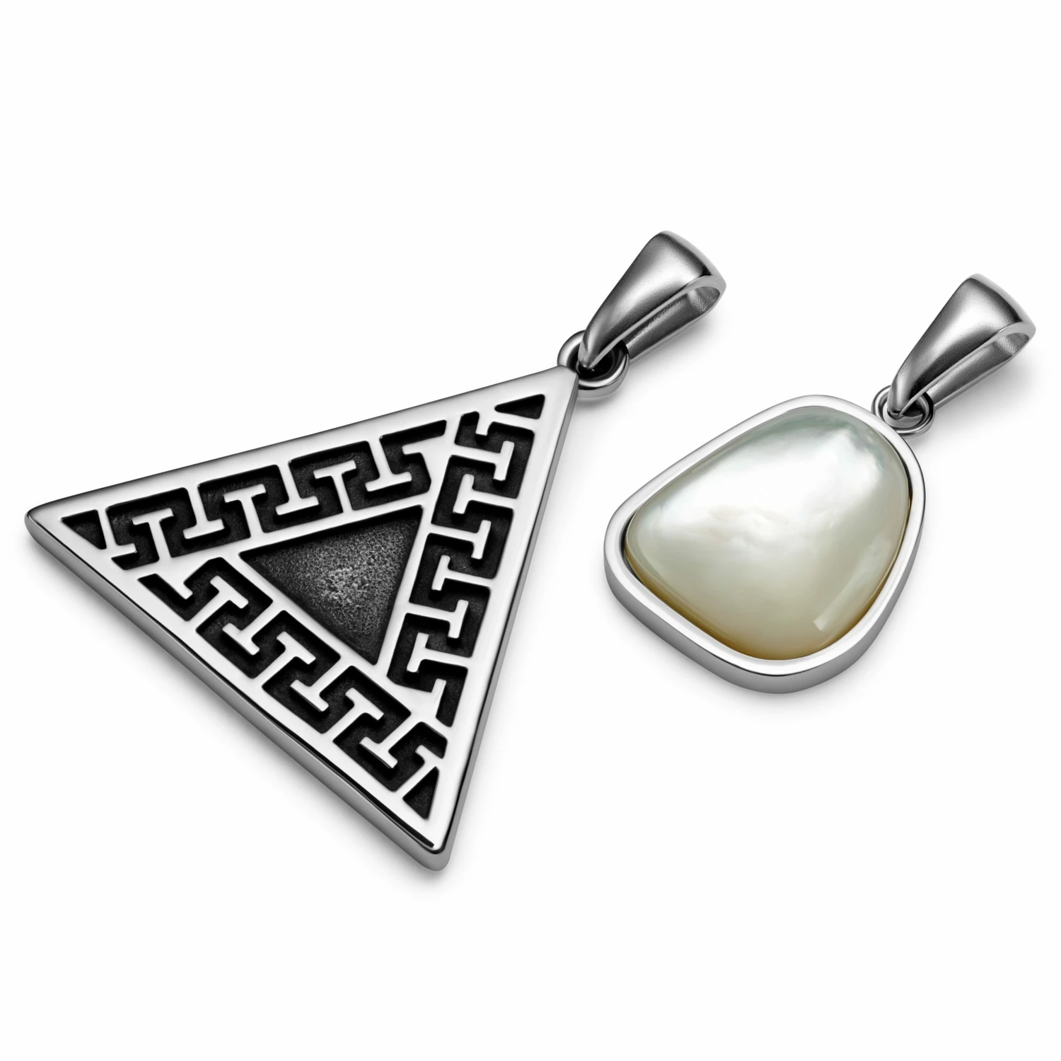 Un set de pendentifs pour les colliers pour homme offrant un saisissant contraste entre éléments naturels et motifs d’architecture classique.